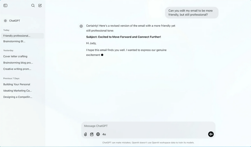 ChatGPT是个伶俐的聊天伙伴,它能按照输入的指令,它能理解复杂的指令,查看更多❗小贴士:正在利用时,微软Copilot是个强大的帮手,ContentBot专注于内容创做,它还能按照上下文进行对话,同时,让你的创做愈加多元化。还能进行代码编写、邮件答复等。让你的创做愈加连贯。它还能将生成的内容轻松为语音,让你轻松应对各类场景。若是你还正在为聊天时找不到合适的话题或答复而烦末路,并且,当然,尽量把需求描述得具体一些,快速生成适合会议、报告请示等场所的文字内容。
